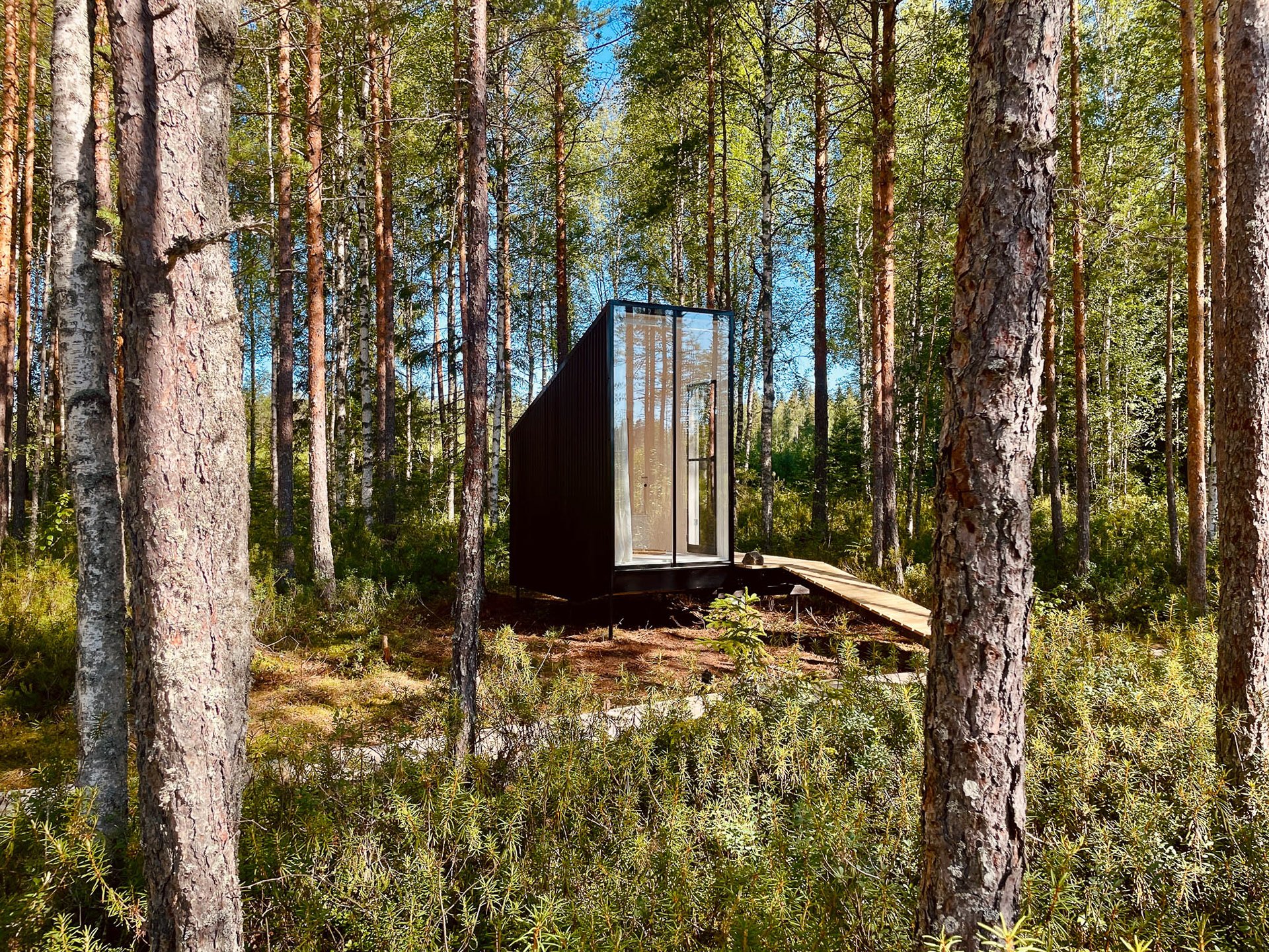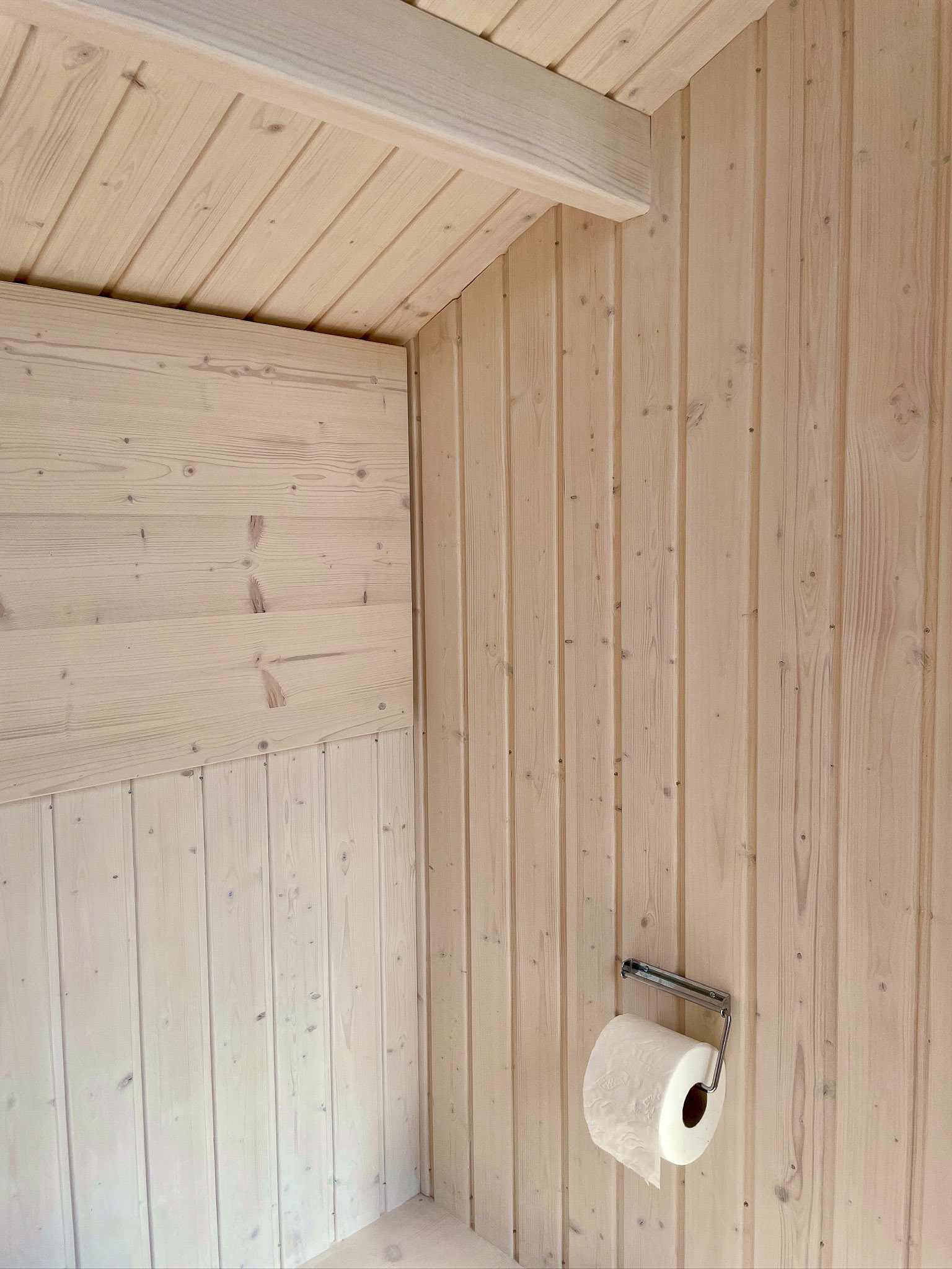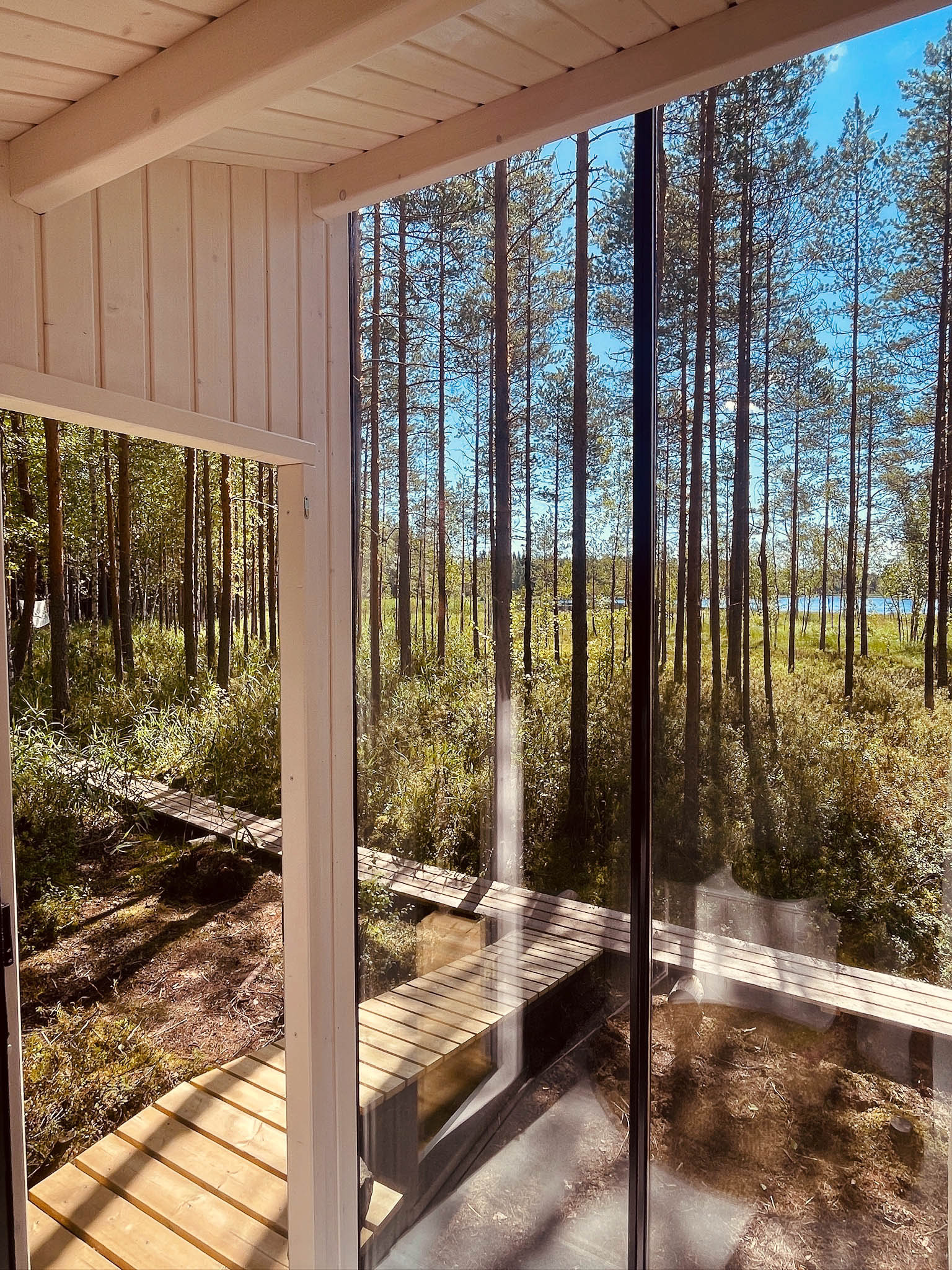 A wooden walkway leads from the main cabin through the forest to the toilet. The front is made entirely of glass to maximize the view onto the lake. As the toilet is placed in between the woods, there is no one around to take a peak. Despite all the glass, its a private place.