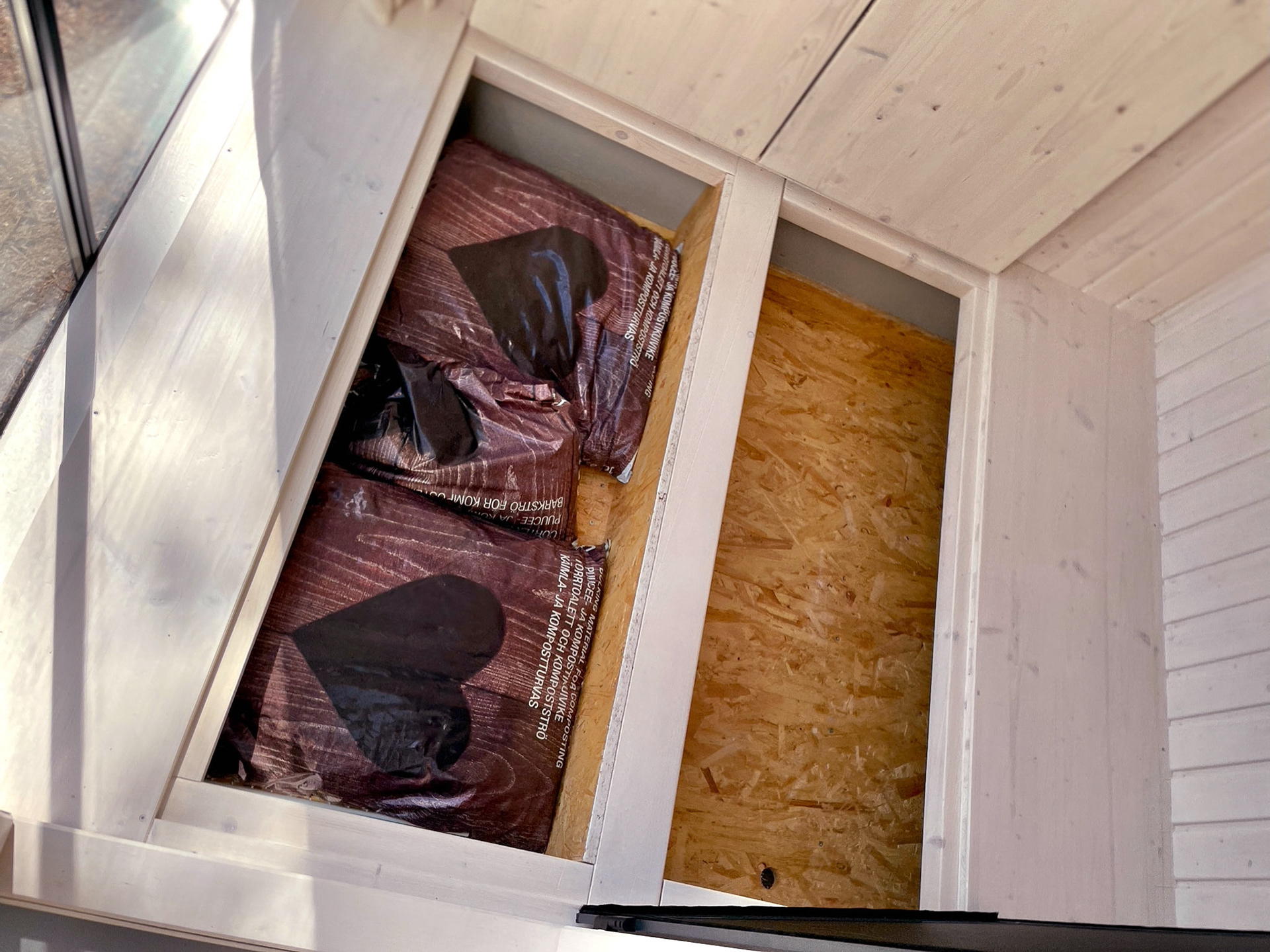 The toilet seat is equipped with a separator insert to separate the dry from the liquid. The dry goes into one of three buckets in the back. The buckets are placed on a rotating disc. When one bucket is full, the disc will be turned to fill up the next one, while the first one already starts the composting process. The liquid goes into a tank outside and can be used as a fertilizer. The compost compartement is airtight and has a hidden ventilation, working with the chimney effect to prevent any smell on the inside.